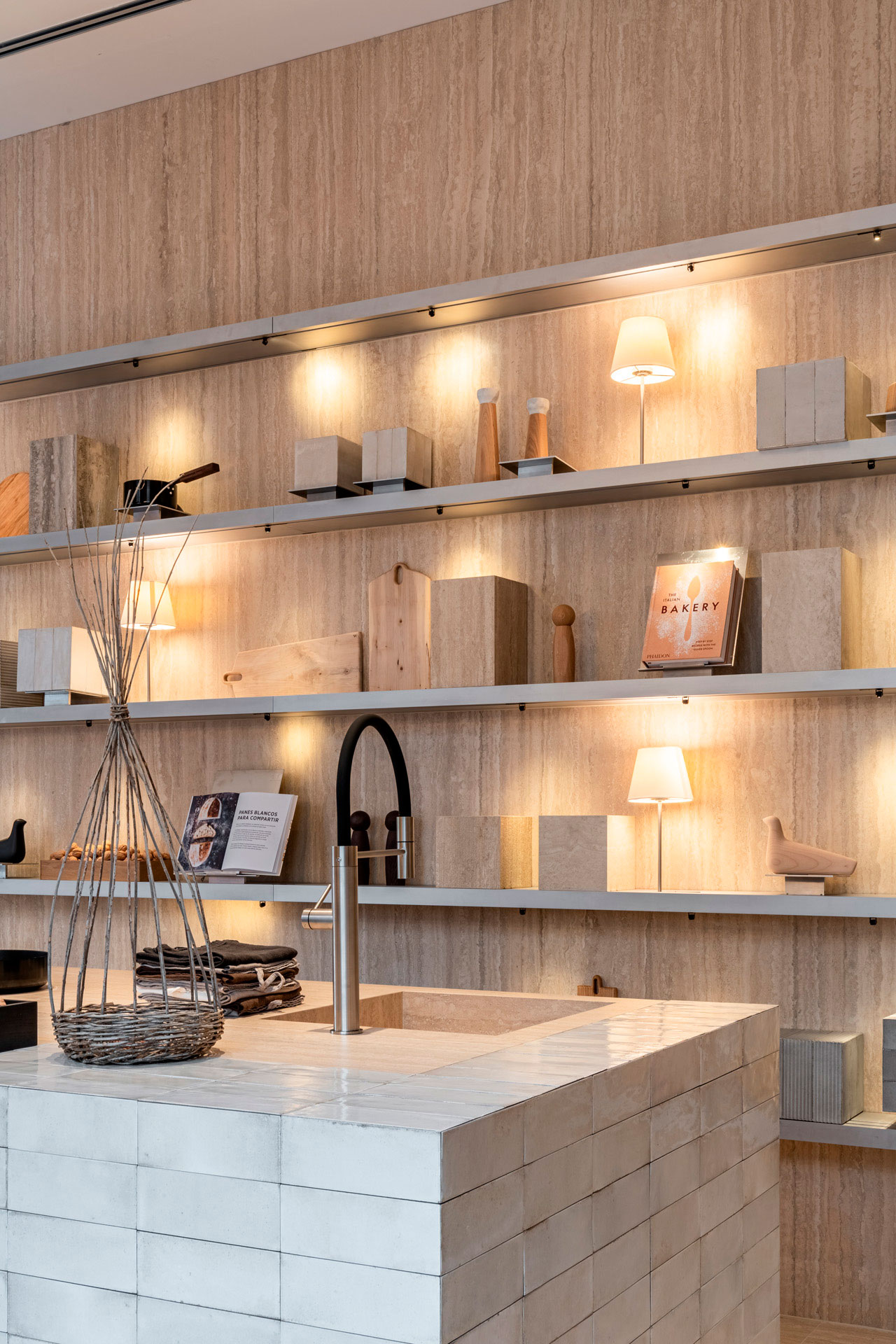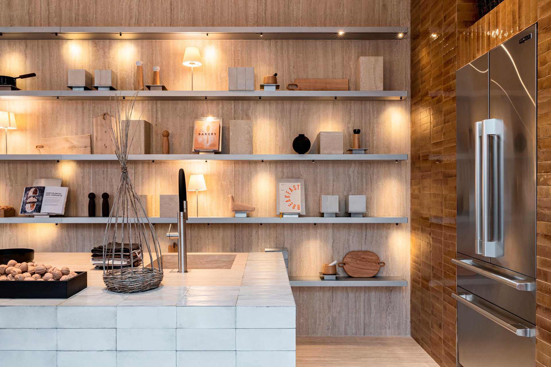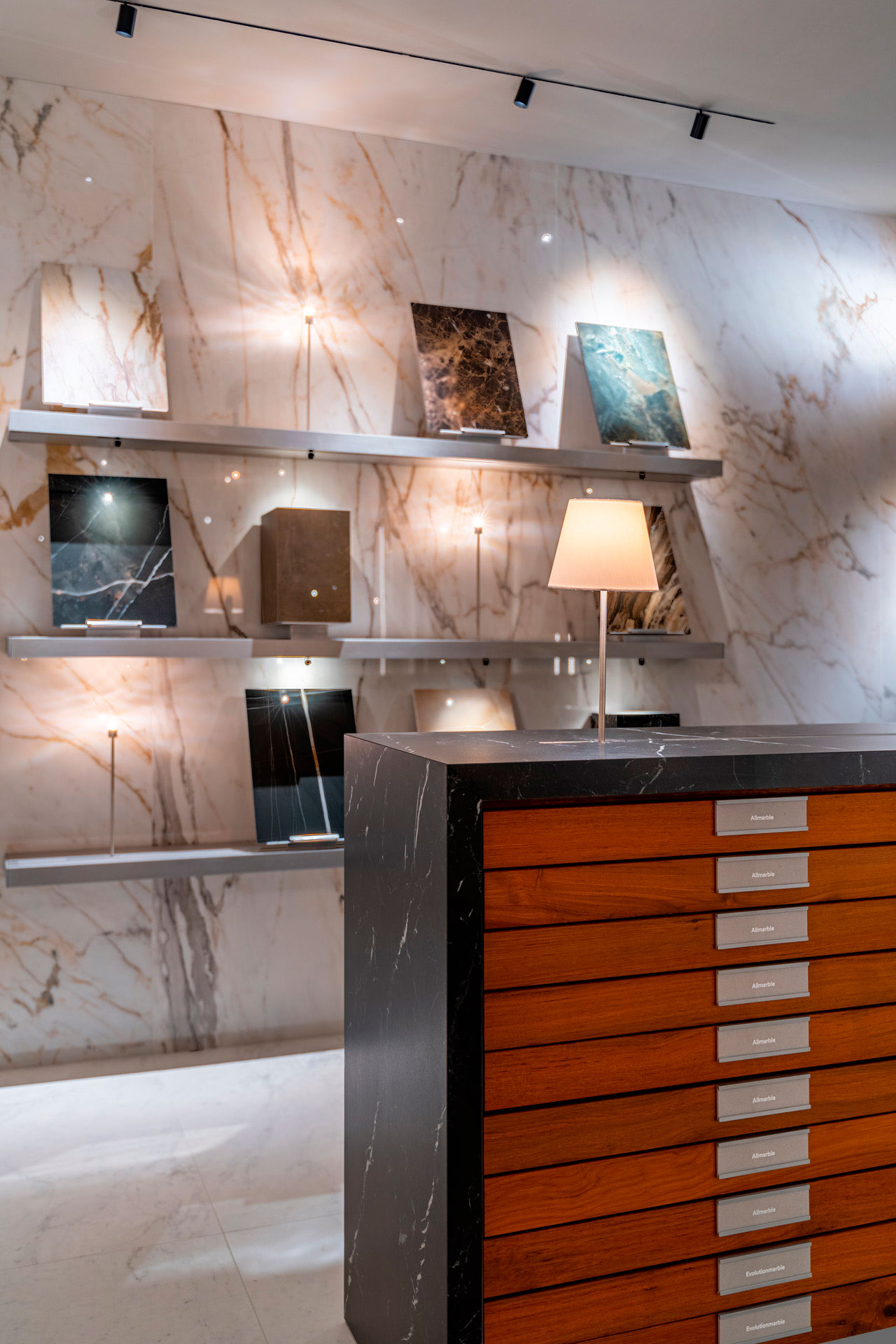 The showroom greets visitors in a hospitable interior, The Welcoming Room, designed in accordance with the Live-In Kitchen concept, in which the compositional versatility of large stoneware slabs and the vibrant gleam of the Crogiolo small-size collections dialogue to connect areas and functions around the kitchen.