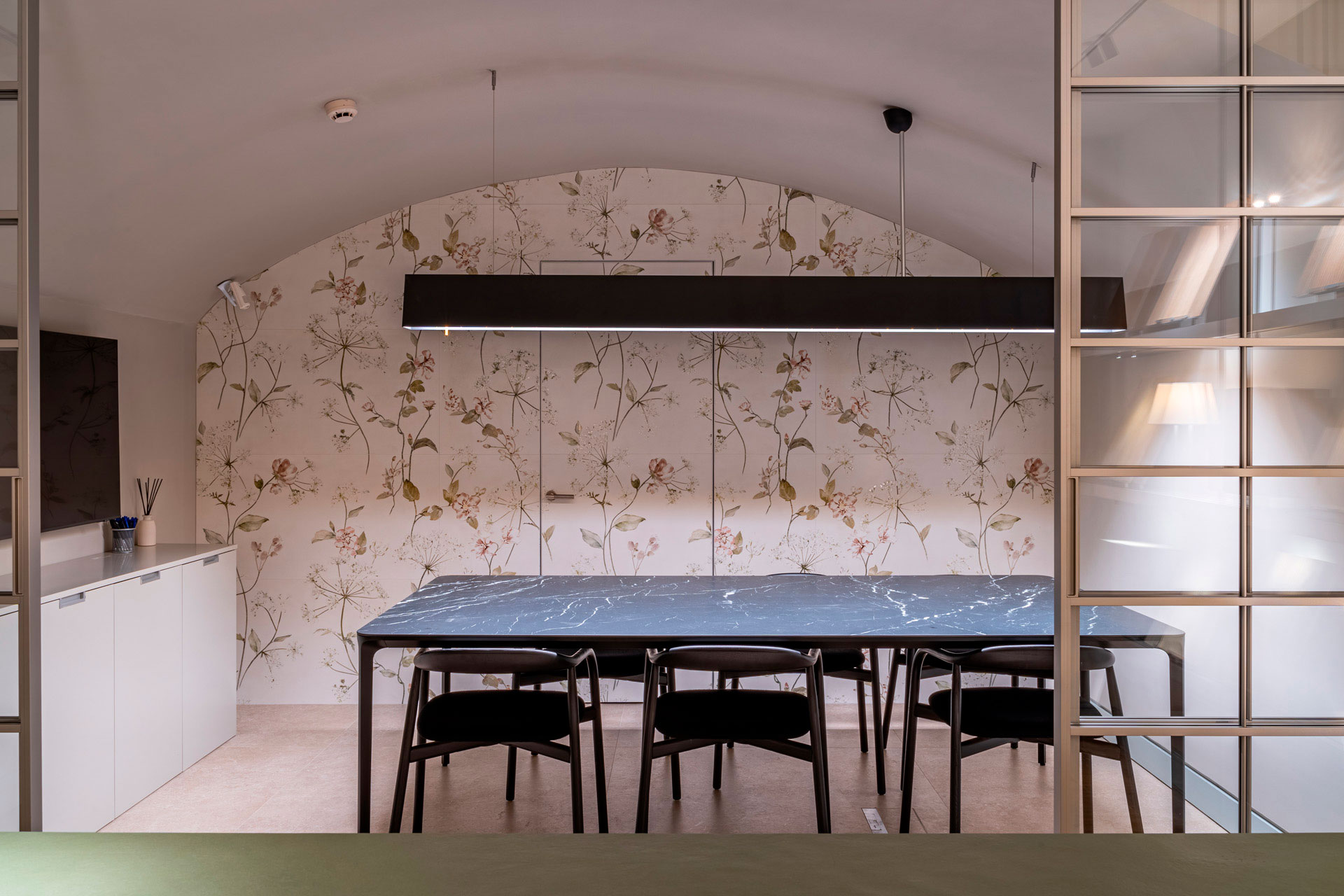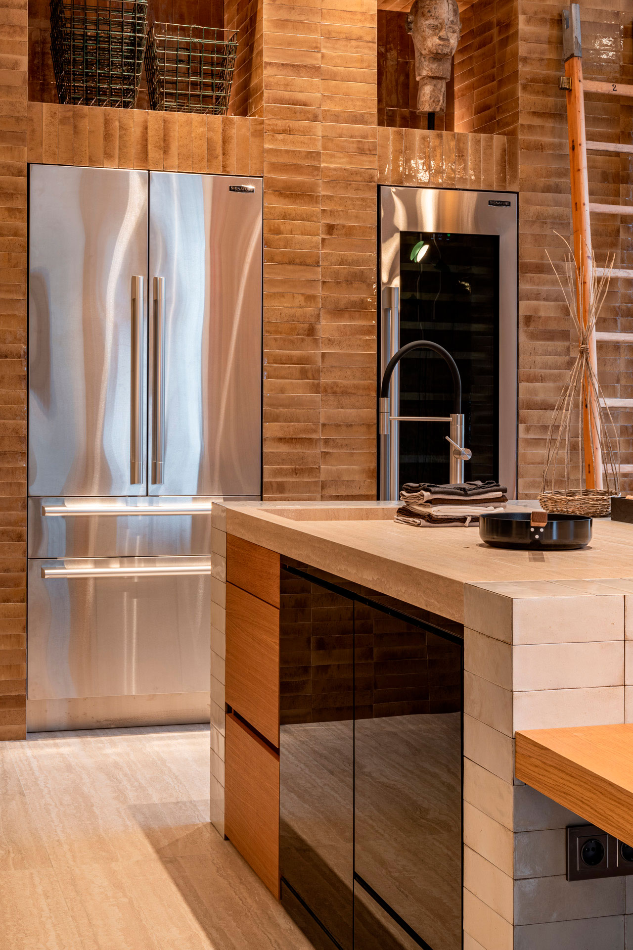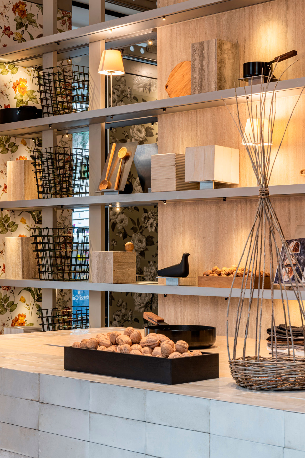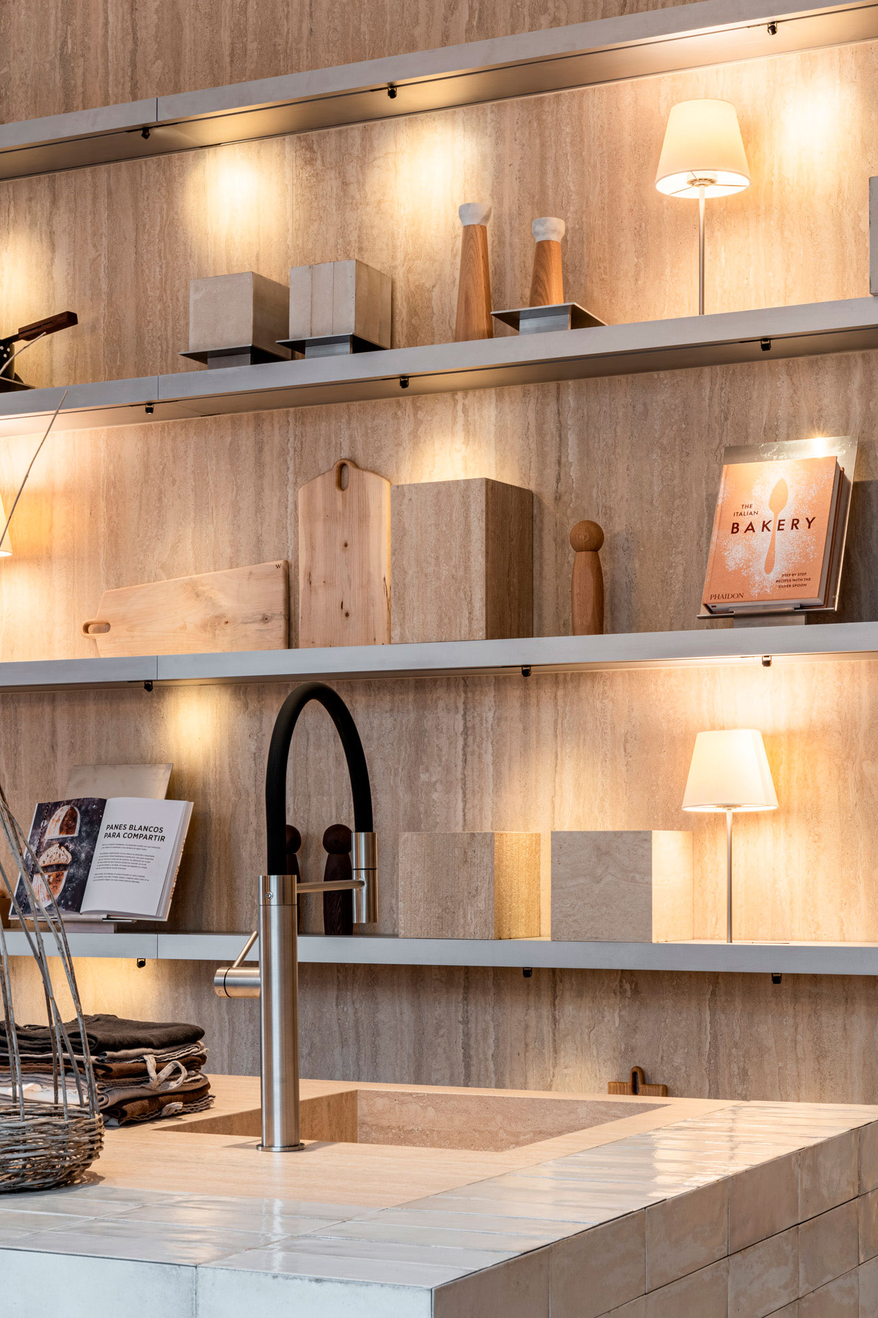 The showroom greets visitors in a hospitable interior, The Welcoming Room, designed in accordance with the Live-In Kitchen concept, in which the compositional versatility of large stoneware slabs and the vibrant gleam of the Crogiolo small-size collections dialogue to connect areas and functions around the kitchen.