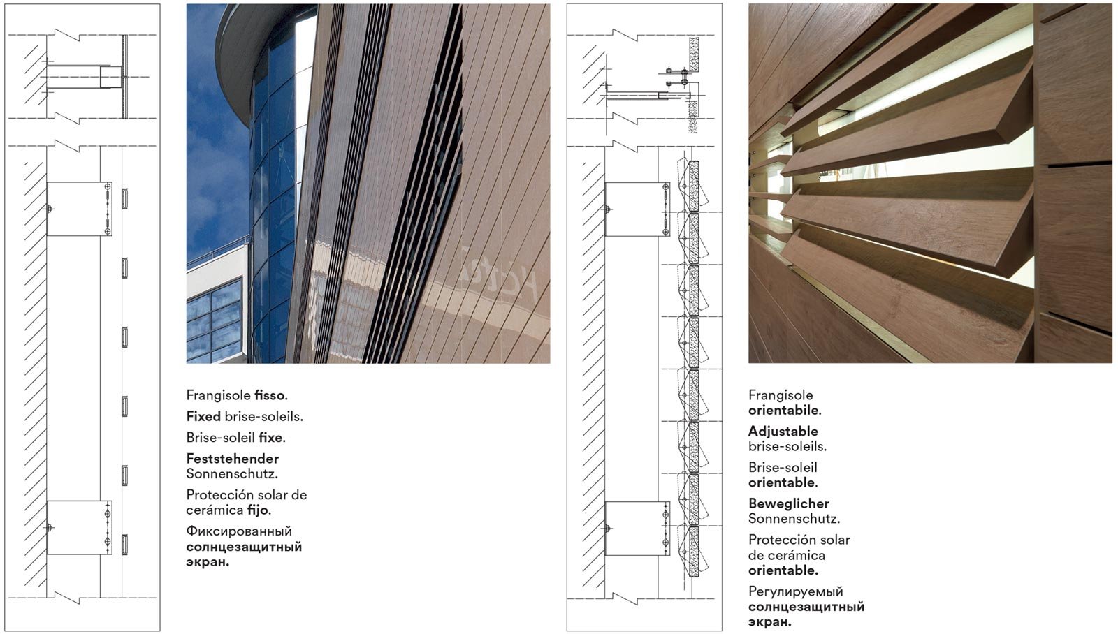 Marazzi Engineering gives architects the freedom to choose between two different system solutions, fixed or adjustable, meaning that the angle of inclination of the brise-soleil blades can be varied in response to geographical, seasonal and building orientation parameters.